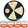 A high-protein buffalo chicken quesadilla stuffed with shredded white-meat chicken, part-skim mozzarella, and spicy buffalo/Red Devil – style cayenne pepper sauce inside a soft 10" flour tortilla. Classic buffalo quesadilla flavors (buffalo sauce + melty cheese + tortilla) make this a crave-worthy, gym-friendly meal prep option that reheats fast. Pair it with ranch or your favorite dip for extra heat and creaminess.